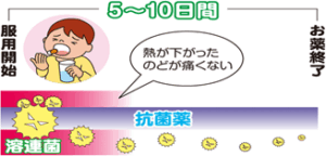 確実に溶連菌を退治し、重大な続発症(合併症)を引き起こさないために、症状が消えても抗菌薬はしばらく飲み続けなくてはいけません。